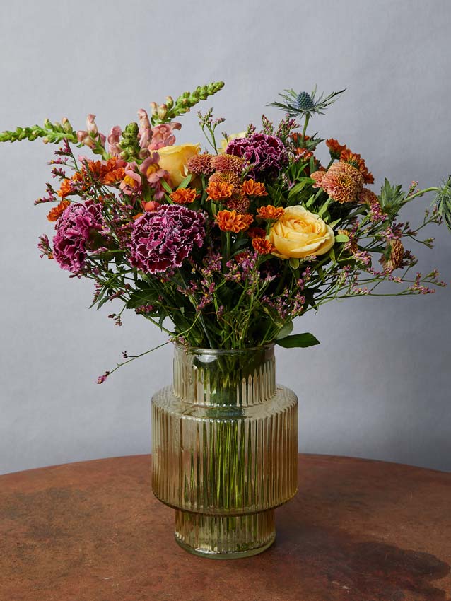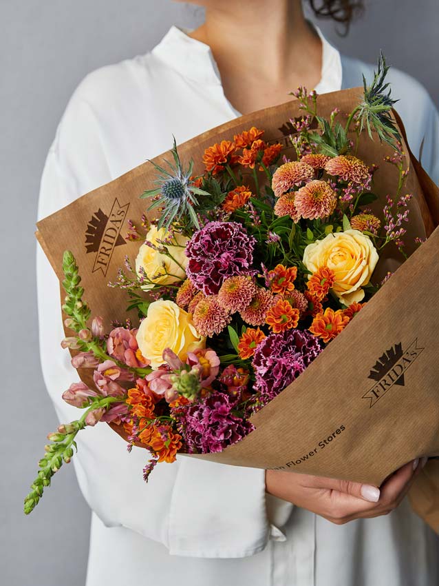 N. B. The bouquet is placed in a glass vase with a height of 21.5 cm and Ø 19.5 cm. The images are for demonstration purposes to show the size of the bouquet. The glass vase is not included and the bouquet will be wrapped as seen in the photograph.