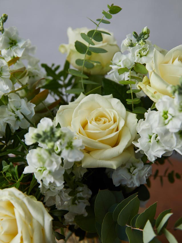 N. B. The bouquet is placed in a glass vase with a height of 18 cm and Ø 11.5 cm. The images are for demonstration purposes to show the size of the bouquet. The glass vase is not included and the bouquet will be wrapped as seen in the photograph.